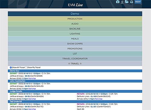 Welcome to EVM 2.0, our Cloud based Event Client management software. Unlike other software currently available all of your data for each event is contained on a single page where you can view and hide any or all aspects of your tour event. This short tutorial will teach you how to use the system to get the data you need for each event to which you’re assigned. The system was built for computers, phones and tablets so it should display comfortably on all of your devices. Let’s look at some ways to use the system as a Viewer: For the viewer the system uses an intelligent and intuitive way to display your events. It’s a simple matter of clicking and viewing.