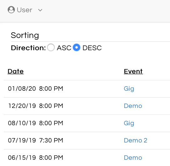 You can now sort the list of events using certain parameters. There are a number of options to make the list viewable... by Date, by Event, by Location and by Venue (if you’re working on a computer) either ascending or descending. (On small mobile devices such as a phone, you can sort by Date, Event or Location only.) Ascending order or ASC simply means that the system will display the oldest events at the top of the page and the newer or future events at the bottom of the page when sorting by date and in alphabetical order when sorting by Event, Location or Venue. Selecting Descending order or DESC is the reverse, where the newest or future events are at the top of the page and the older events are at the bottom when sorting by date and reverse alphabetical order when sorting by Event, Location or Venue. To sort Ascending by Date, first click the button labeled ASC if it isn’t already selected and click the word Date at the top of the date column. To reverse the order by date click the button labeled DESC and then click the word Date at the top of the date column. Use the same functionality to sort by the other options… Event, Location or Venue. The screen will refresh each time with the list sorted based on your criteria.